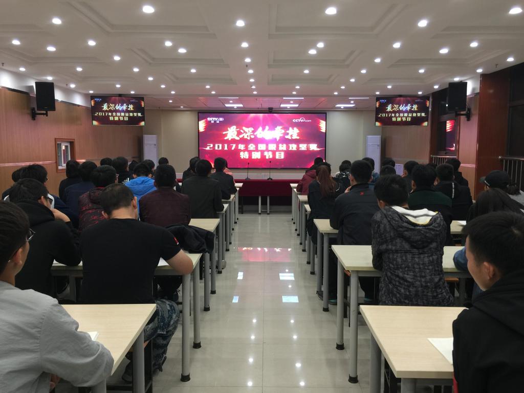 2017年10月17日21:15,beat365在线唯一官网党委宣传部、学生工作办公室组织学院辅导员和各班班长、团支书,在汽车机电大楼四楼报告厅,收看“2017脱贫攻坚奖特别节目”。