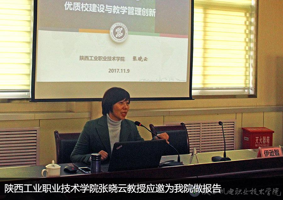 2017年12月8日下午,陕西工业职业技术学院院长张晓云教授应邀莅临我院,作《优质校建设与教学管理创新》主题讲座。讲座由学院党委书记、院长伊逊智同志主持,学院领导班子成员、中层干部和教研室主任现场聆听讲座。