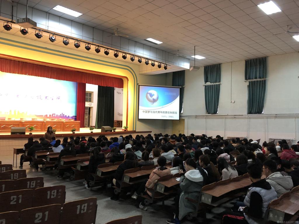 为进一步加强学生思想政治教育,使在校大学生明确中国梦的伟大内涵与意义,认识新时代青年学生的责任与担当,学院于12月4日下午在大礼堂举办《中国梦与当代青年的责任和担当》专题讲座,由专职辅导员齐晓红老师主讲,700多名17级学生聆听了本次讲座。
