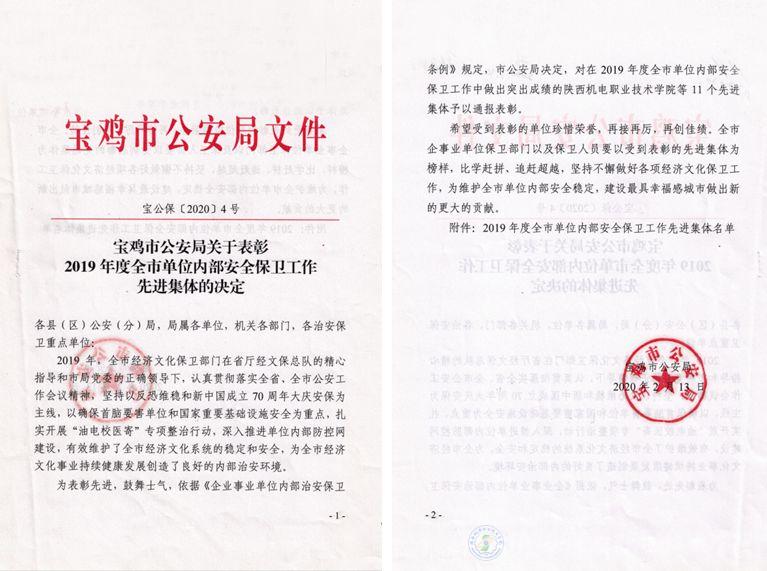 近日,宝鸡市公安局下发《关于表彰2019年度全市单位内部安全保卫工作先进集体的决定》(宝公保﹝2020﹞4号),beat365被授予“宝鸡市2019年度单位内部安全保卫工作先进集体”荣誉称号。