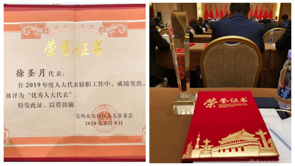 5月9日,宝鸡市金台区第十八届人民代表大会第五次会议在宝鸡建国饭店召开,会上表彰了21名2019年度“优秀人大代表”,学院副院长徐圣月被宝鸡市金台区人大常委会授予2019年“优秀人大代表”荣誉称号。