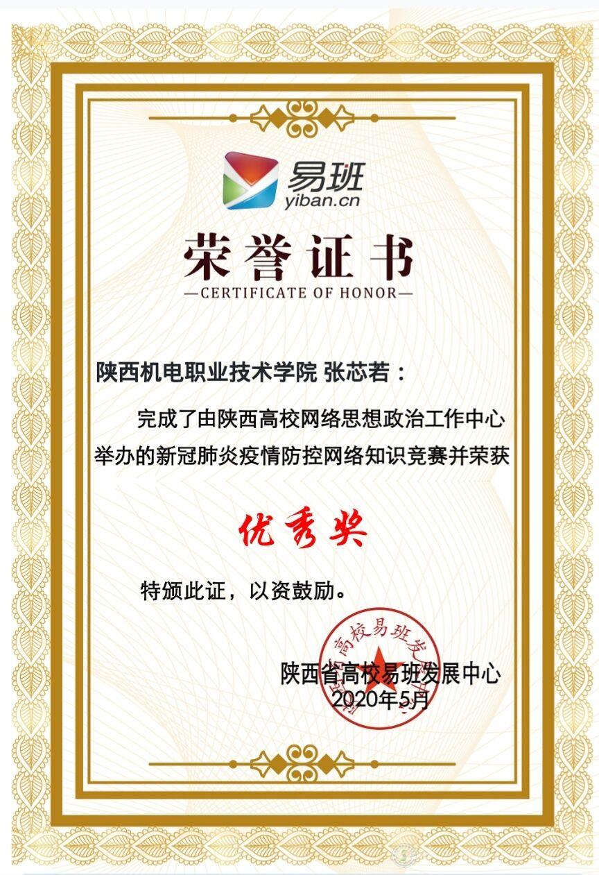陕西高校网络思想政治工作中心、陕西省高校易班发展中心发布《陕西高校大学生新型冠状病毒肺炎疫情防控网络知识竞赛获奖名单的公告》,公布本次知识竞赛优秀组织奖名单和个人获奖名单,其中全省高校优秀组织奖15个(其中高职类院校5个),高校个人奖227个(其中高职类院校56个)。beat365师生在本次知识竞赛中表现出色,喜获“优秀组织奖”,我院16动漫五年班张芯若同学获得“优秀奖”。