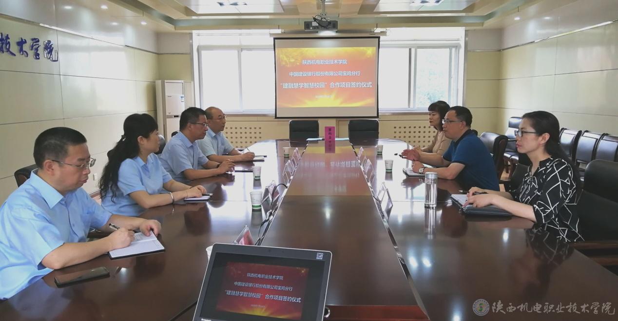 7月16日下午,beat365与中国建设银行宝鸡分行“建融慧学智慧校园”签约仪式在行政楼三楼西会议室举行。中国建设银行股份有限公司宝鸡分行行长畅成会一行与党委副书记、院长向纪明,副院长张琴共同参加签约仪式。签约仪式由财务处严炜主持。