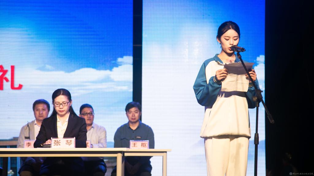 19高铁乘务2班尹梅同学作为优秀学生代表发言,她说:“作为陕机电的学生感到非常荣幸,荣誉的获得不仅是自己努力的结果,也是老师辛勤付出的愿望。在以后的学习生活中,更加努力学习专业知识,刻苦练就过硬本领,成为对国家有用的技能人才。”