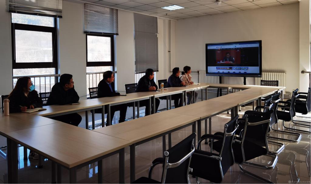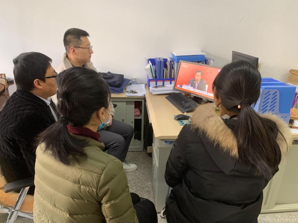 上午10时,学校党委理论学习中心组(扩大)——党政办、党委组织部在蟠龙校区图书馆二楼会议室集中收看了新闻发布会。
