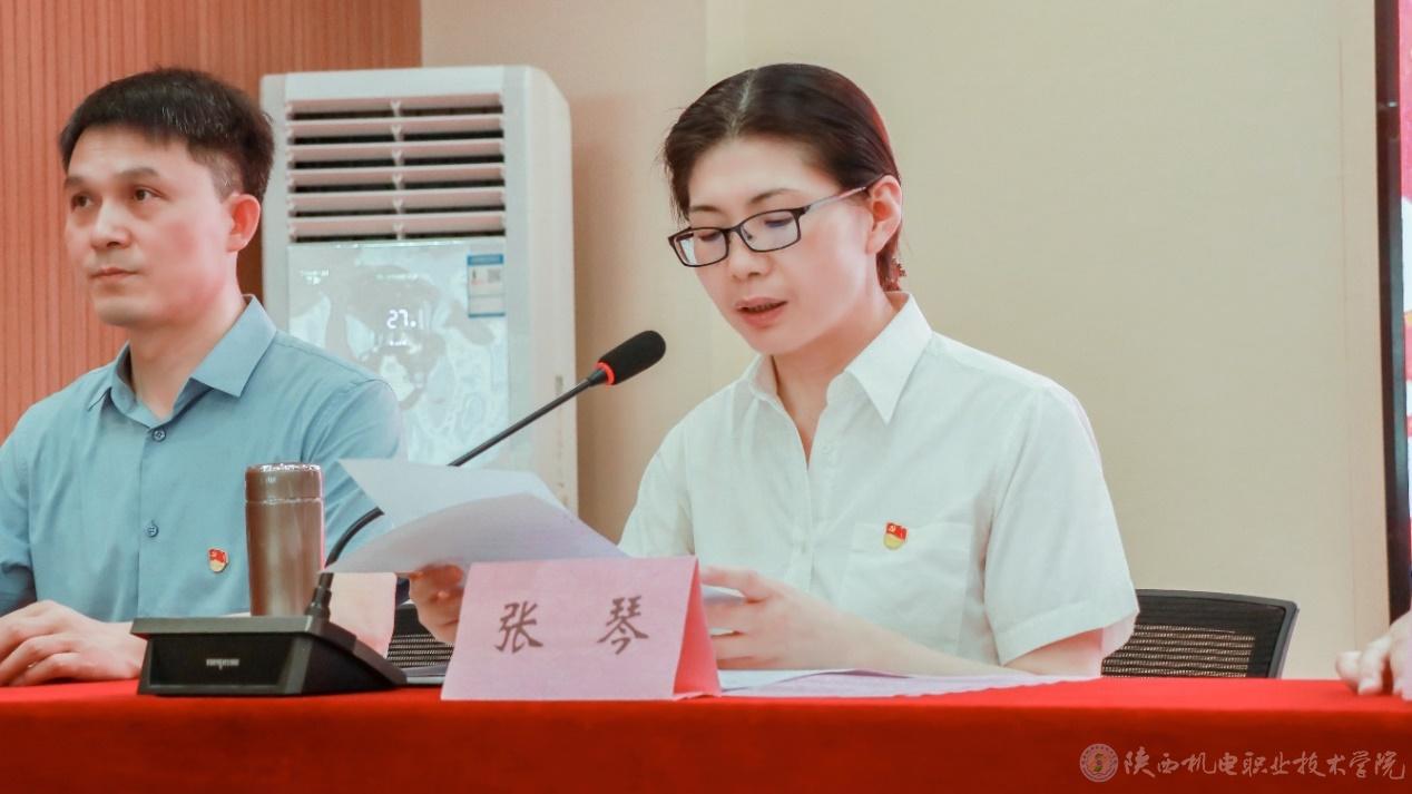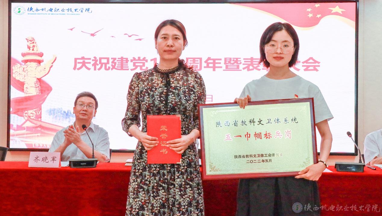 院长助理赵争东宣读陕西省教科文卫体工会《关于表彰2022年陕西省教科文卫体系统五一巾帼标兵和标兵岗的通报》并为五一巾帼标兵电子与信息学院副教授张琼和五一巾帼标兵岗智能制造学院机电系颁奖。