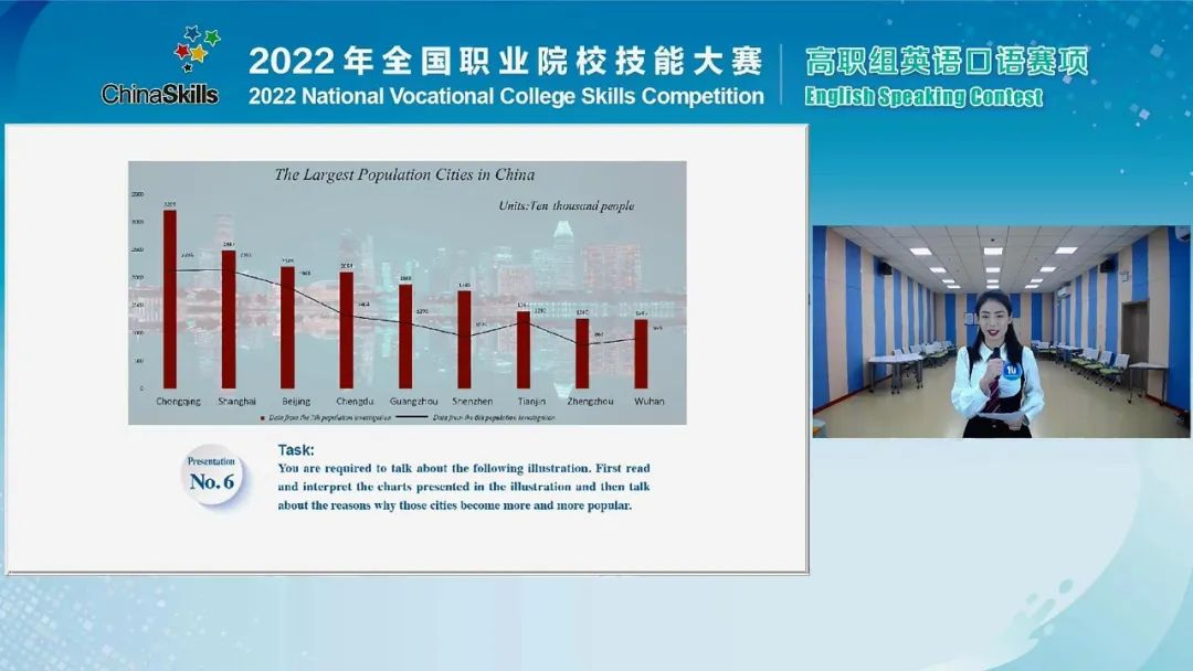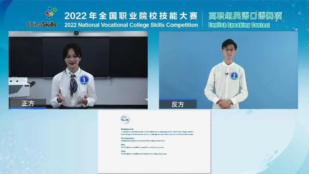 本赛项共包括“中国故事”“情景交流”“职场描述”“职场辩论”四个竞赛环节。在“中国故事”环节,选手发表精彩演讲,讲述中国故事,弘扬中华文化;在“情景交流”环节,选手与提问嘉宾模拟职场职业情境问答;在“职场描述”环节,选手根据赛题图片分析行业、企业发展趋势或社会、经济等热点问题,阐述个人观点;在“职场辩论”环节,选手围绕职业领域的社会热点问题激烈辩论。比赛精彩纷呈、高潮迭起,选手以妙语连珠彰显语言艺术,以职场思辨比拼能力素养,以线上互动连结赛场内外,充分展现了新时代高职院校外语技能人才的青春风采。