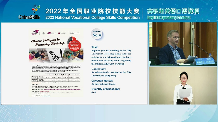 2022年9月26日,全国职业院校技能大赛高职组英语口语赛项顺利开赛,经大赛办、执委会遴选,我院名师工作室主持人、基础部李明副教授受邀,担任本届大赛裁判长。