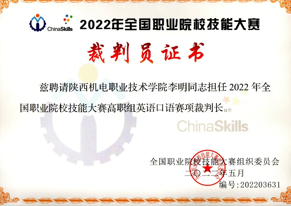 我院李明副教授受邀任2022年全国技能大赛英语口语赛项裁判长