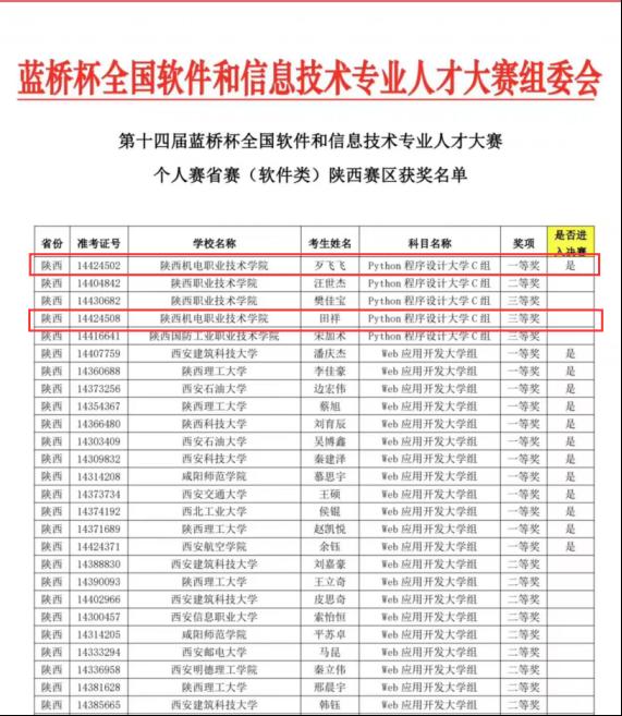 2023年4月8日,国家工业和信息化部举办的第十四届蓝桥杯陕西省省赛在宝鸡文理学院举行。beat365在线唯一官网电子与信息学院厚溥IT软件学院 严鑫 老师指导的 歹飞飞、田祥 同学分别获省赛一等奖、三等奖的好成绩,其中歹飞飞同学取得国赛参赛资格。