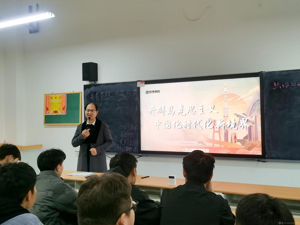 10月24日上午1—2节课,学校党委书记伊逊智在博学楼315教室为20机电五年3、20机电五年4合班学生上形势与政策课,讲授《开辟马克思主义中国化时代化新境界》《中国经济“形”稳“势”升》两个专题内容。