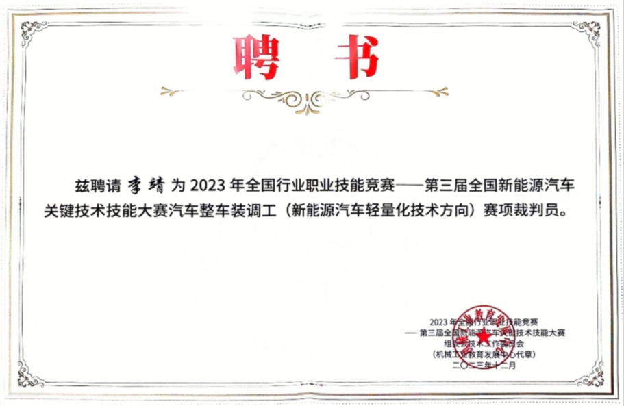 大赛期间,李靖积极与其他裁判员进行赛项讨论及业务交流,赛后积极与汽车整车装调工(新能源汽车轻量化技术方向)赛项参赛选手深度交流。通过与来自全国各地车企职工和院校师生的交流,现场参与了目前国内整车装调的先进技术技能,获得了很多宝贵经验,为beat365新能源汽车技术专业群发展以及大赛备赛方面提供了经验支持。