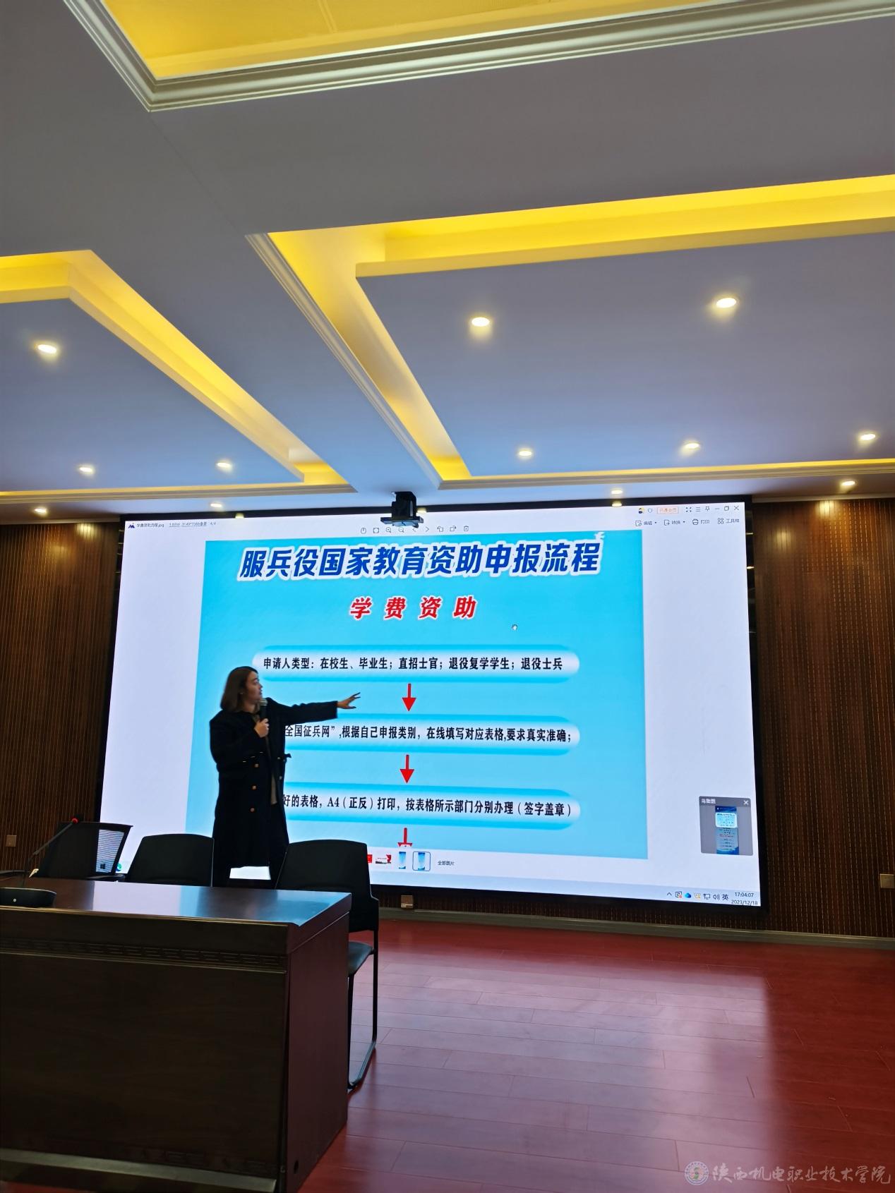 张海波梳理了退役士兵助学金、退役士兵学费补偿、学费减免等政策,教育引导学生要认识到国家对退役士兵的学业帮扶和支持。