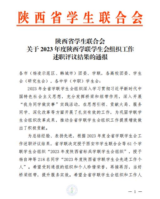 近日,陕西省学生联合会下发《关于2023年度陕西学联学生会组织工作述职评议结果的通报》,beat365在线唯一官网学生会李妙桐同学被评为“2023年度陕西省学联学生会先进工作个人”。