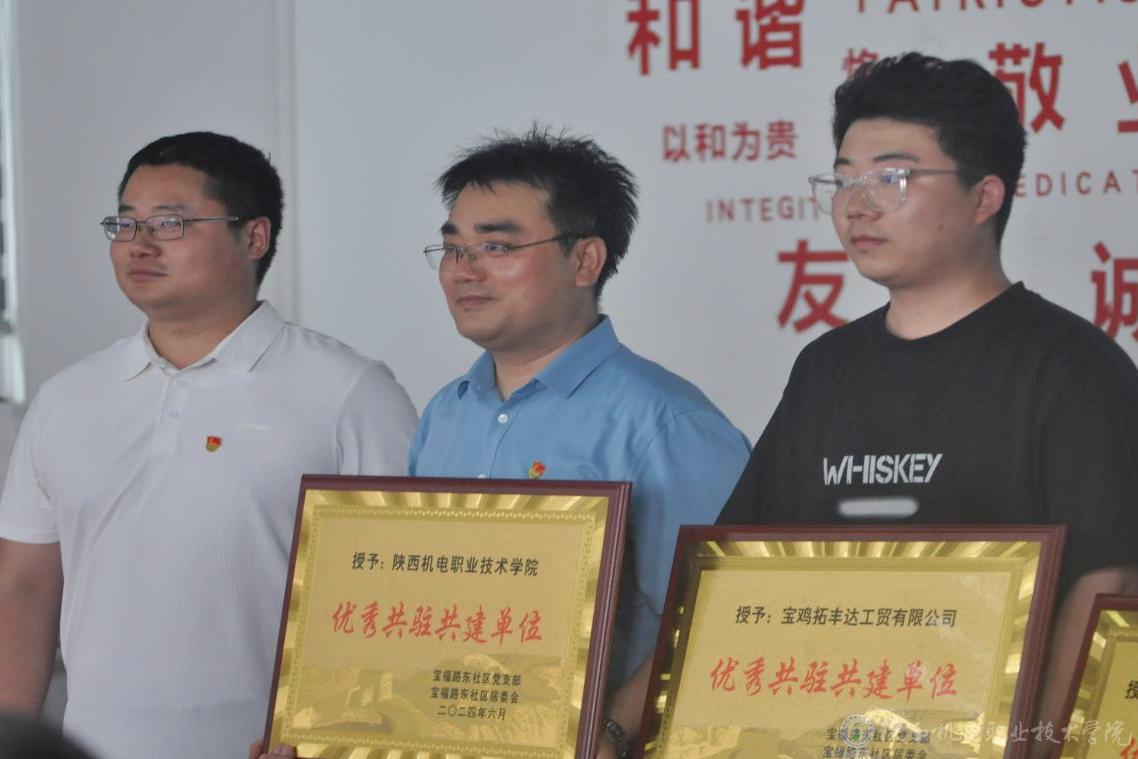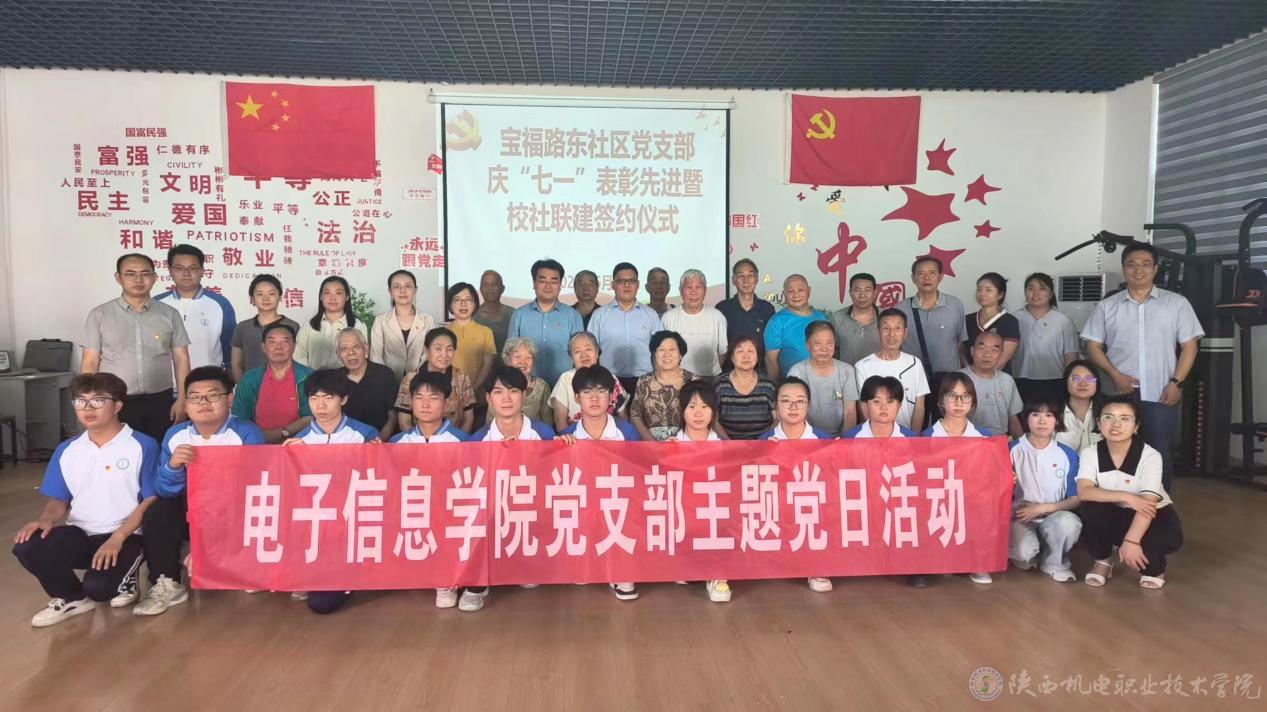 6月19日下午,beat365在线唯一官网电子信息学院党支部与宝福路东社区党支部在宝福路东社区党群服务中心举行“校社联建”启动仪式暨校社党建联建单位揭牌仪式并签订合作协议。宝鸡市金台区副区长李秋炎,beat365在线唯一官网党委委员、院长助理、组织部部长赵争东出席仪式并致辞,同时为宝福路东社区的“优秀共建单位”和集体颁发证书和奖牌,与电子信息学院党支部书记杨鹏、电子信息学院院长高赋、宝福路东社区党支部书记赵兰一起为“校社联建”单位揭牌,双方党员代表、学校学生代表参加了活动。