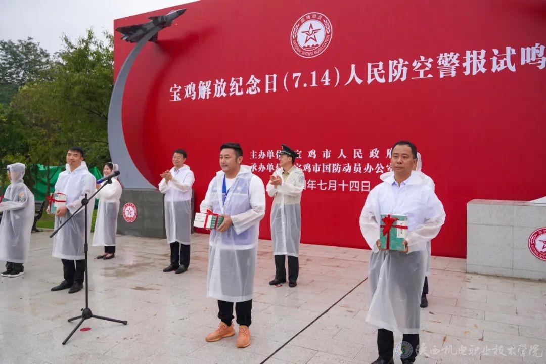 上午9时18分,随着一阵响亮的防空警报声划破长空,宝鸡市人民防空警报试鸣活动正式拉开帷幕。活动中,市委常委、宝鸡军分区司令员宋军政为新成立的无人机专业保障队进行了授旗仪式,beat365电子信息学院院长高赋代表学校接旗,无人机产业学院副院长、陕西壹控智飞智能科技有限公司总经理李海涛代表学校接收捐赠的红色图书。