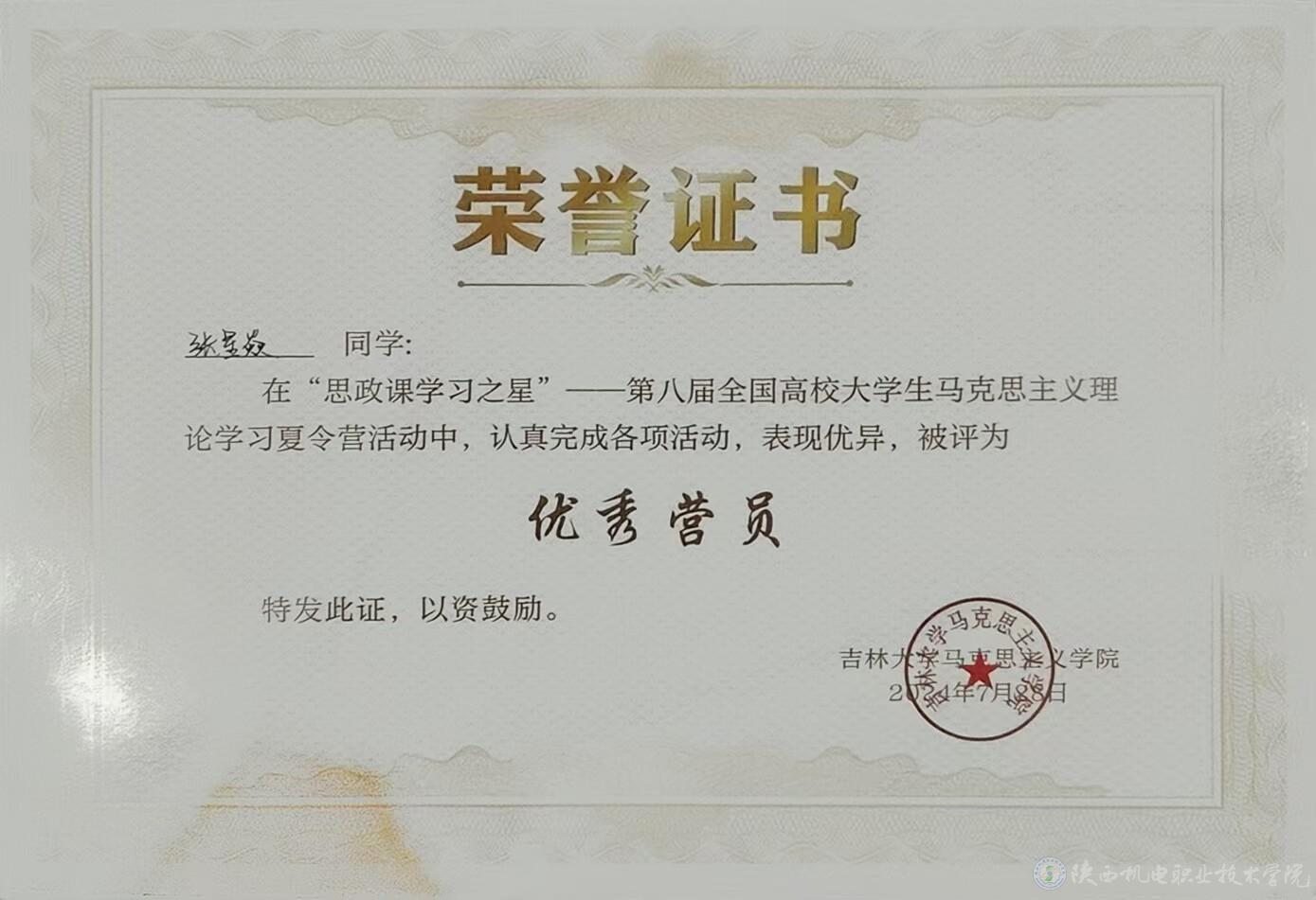 7月21—28日,第八届全国大学生马克思主义理论学习夏令营在吉林省举行。经学校推荐、陕西省委教育工委遴选,beat365在线唯一官网铁道工程学院张星焱同学作为陕西省5名学生代表之一参加了本次活动并获“优秀营员”荣誉称号。