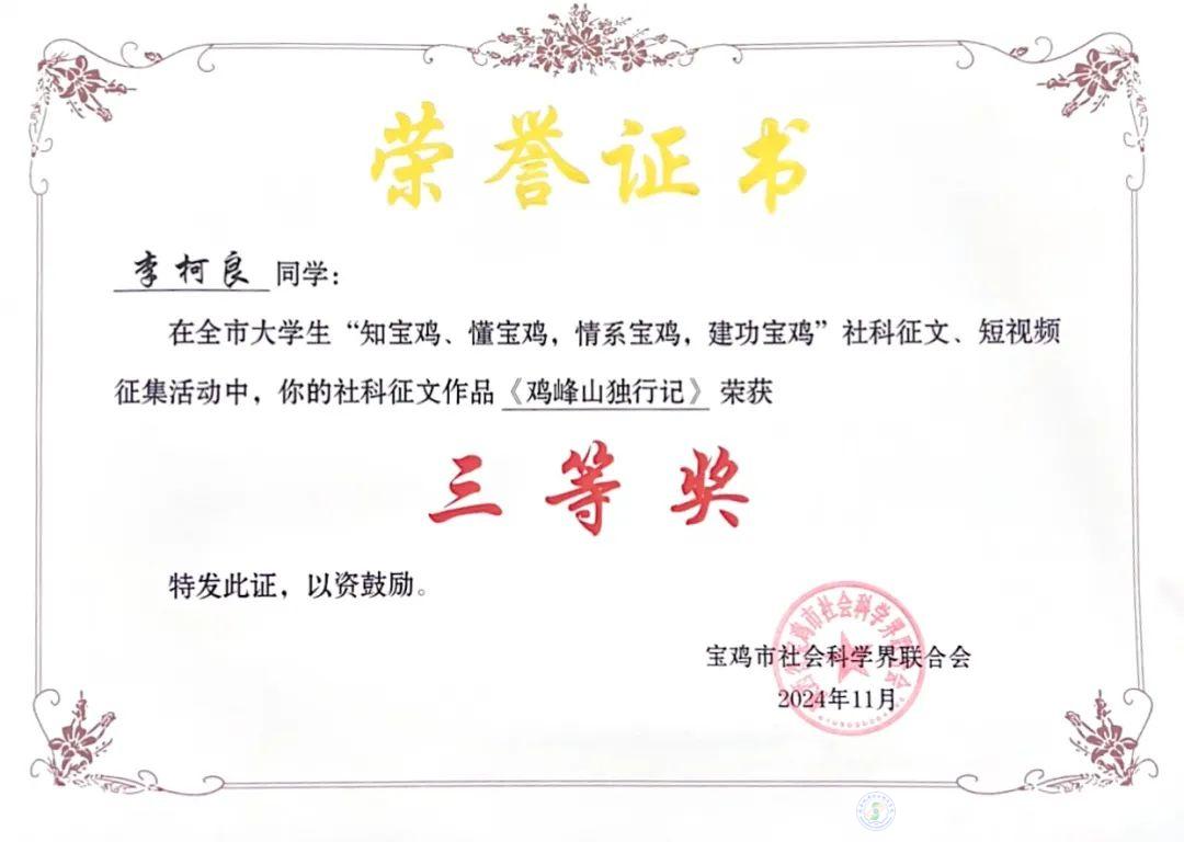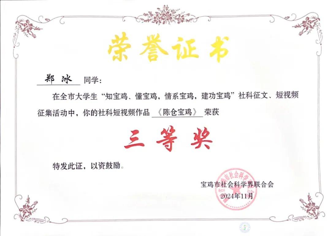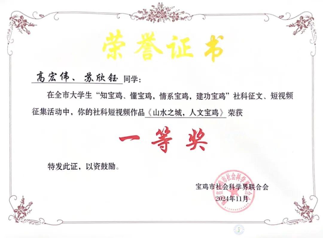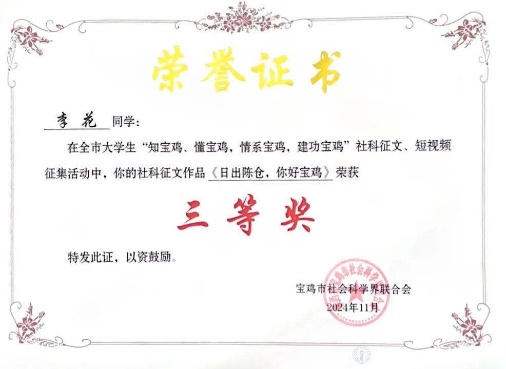 根据《关于在全市在校大学生中开展“知宝鸡、懂宝鸡,情系宝鸡,建功宝鸡”社科征文、短视频征集活动的通知》,由宝鸡市社科联联合在宝高校共同举办的“知宝鸡、懂宝鸡,情系宝鸡,建功宝鸡”社科征文、短视频征集活动评选结果出炉,beat365学子在征集活动中荣获一等奖1项、三等奖3项,刷新最好成绩,实现历史性突破。