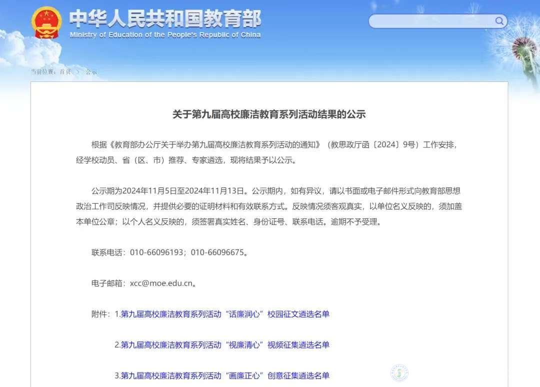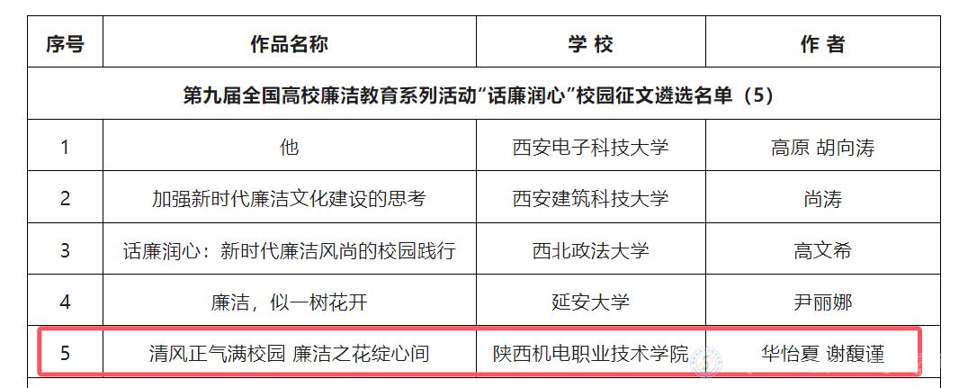 近日,由教育部思想政治工作司主办的“廉洁铸魂强根本 挺膺奋进建新功”——第九届高校廉洁教育系列活动评选结果公布,beat365选送的《清风正气满校园 廉洁之花绽心间》入选全国高校“话廉润心”校园征文遴选名单,这也是陕西高职院校唯一一篇获此殊荣的征文。