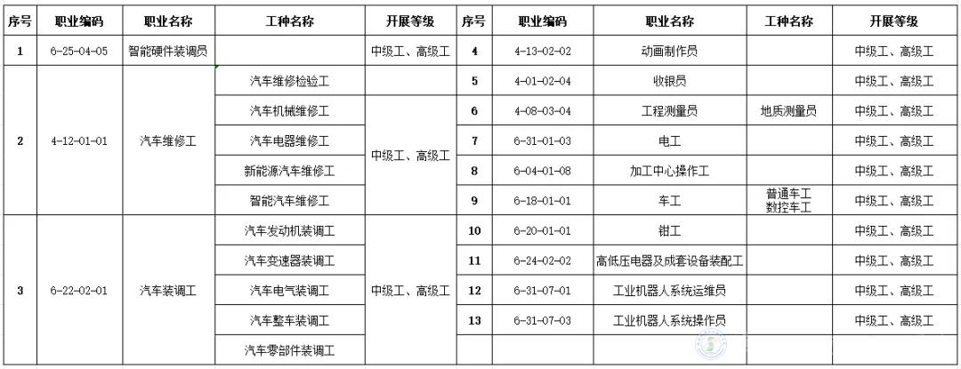 beat365获批13个技能等级认定职业(工种),详情如下表:
