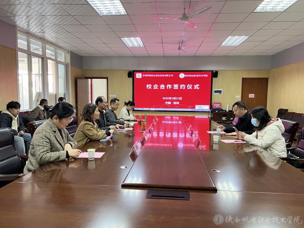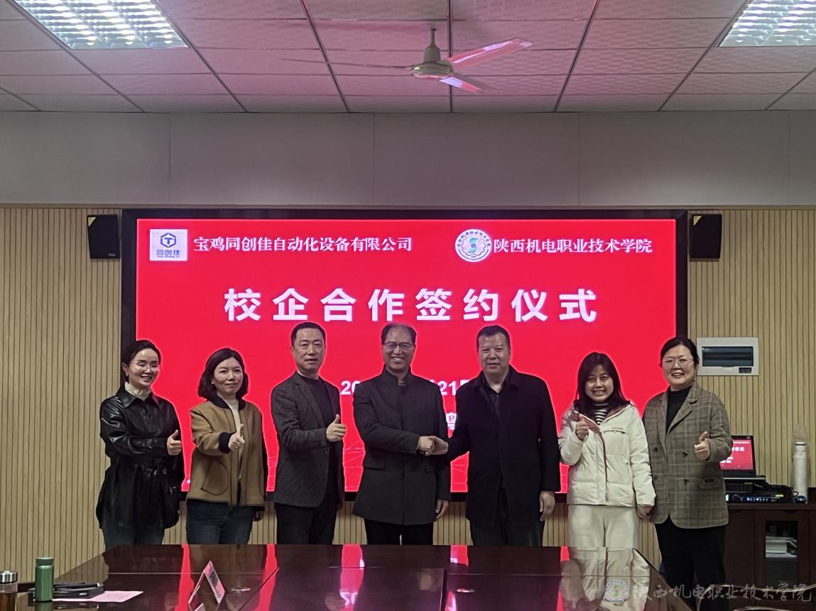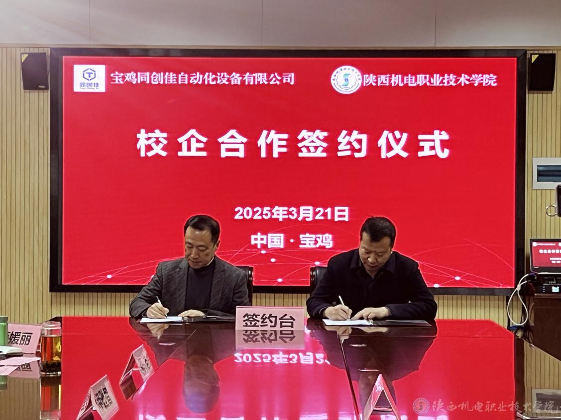 3月21日上午,beat365在线唯一官网与宝鸡同创佳自动化设备有限公司校企合作签约仪式在学院图书馆二楼会议室隆重举行。宝鸡同创佳自动化设备有限公司总经理刘朝龙、行政经理吕艳妮,beat365在线唯一官网党委书记伊逊智,党委委员、副院长张克出席签约仪式。会议由校企合作处处长白娟娟主持。