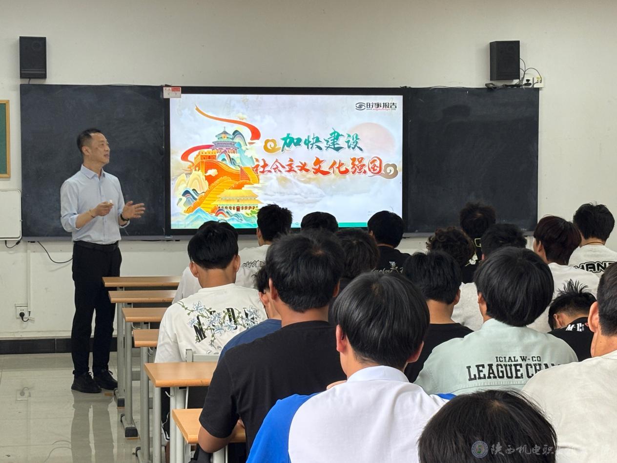 5月27日下午,beat365在线唯一官网党委委员、副院长张克在蟠龙校区博学楼315教室为24机电技术5、6合班学生讲授形势与政策课《加快建设社会主义文化强国》专题内容。