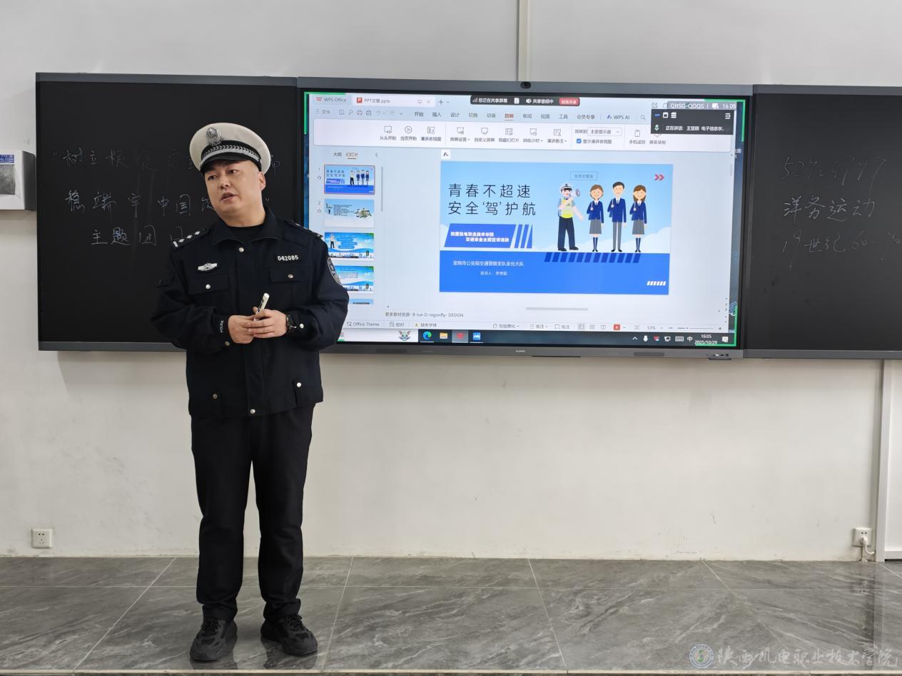 排查行动开展的同时,一场面向全校师生的交通安全知识讲座在启航楼2楼208教室如期举行。金台大队乔世超警官应邀担任主讲。讲座中,乔世超结合高校校园及周边的交通特点,通过多媒体课件、典型案例视频分析等形式,深入浅出地向师生们讲解了,常见交通违法危害,详细剖析了酒后驾驶、超速行驶、闯红灯、分心驾驶(如开车使用手机)、不系安全带等违法行为的严重性与后果。重点强调了行人、非机动车骑行者在参与交通时应遵守的规则,如何规避车辆视觉盲区,以及雨天、夜间等特殊条件下的安全出行要点。简要介绍了发生交通事故后的基本处理流程和自救互救知识。对《中华人民共和国道路交通安全法》中与师生日常出行密切相关的条款进行了普及说明。讲座现场气氛活跃,互动环节师生提问踊跃。乔世超用真实案例和权威数据,为师生敲响了交通安全警钟,使“文明交通、安全出行”的理念更加深入人心。