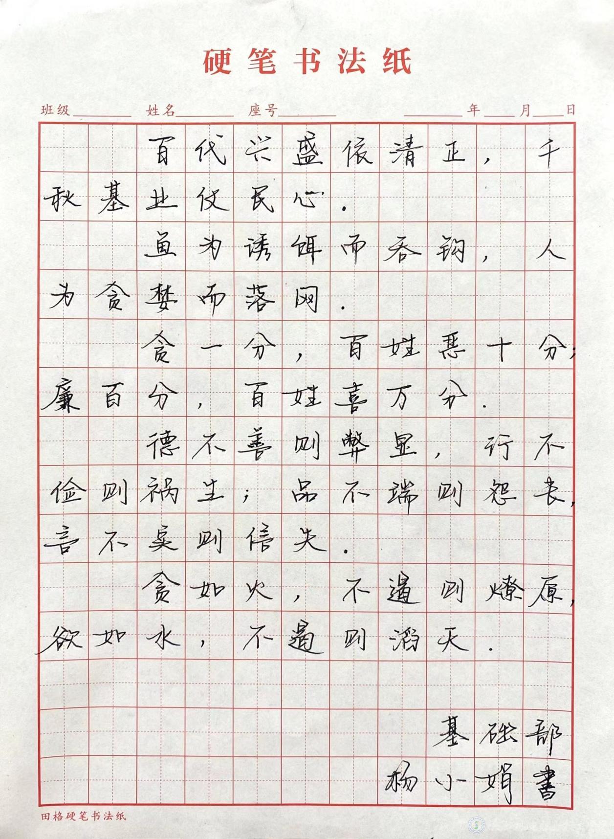 通过笔端的挥毫泼墨,党员教师们能在静心、专心地书写、作画的同时思索廉洁的含义,这本身也是对廉洁的体悟和践行。结合文化艺术形式的廉洁宣传能够有效地弘扬和传播廉洁精神,不仅丰富了支部党员和群众的精神文化生活,同时也有助于积极营造风清气正的廉政文化氛围,使部门全体党员和群众受到一次廉政教育的精神洗礼。