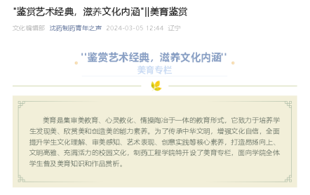 美育是集审美教育、心灵教化、情操陶冶于一体的教育形式,它致力于培养学生发现美、欣赏美和创造美的能力,全面提升学生文化理解、审美感知、艺术表现、创意实践等核心素养。米兰milan官方网站将美育教育与文化建设相结合,在“制药青年之声”微信公众号上推出了"鉴赏艺术经典,滋养文化内涵"——美育鉴赏专栏,通过展示中国名画和名家书法,启迪学生对艺术审美的思考,打造昂扬向上、文明高雅、充满活力的校园文化,传承中华文明,增强文化自信。