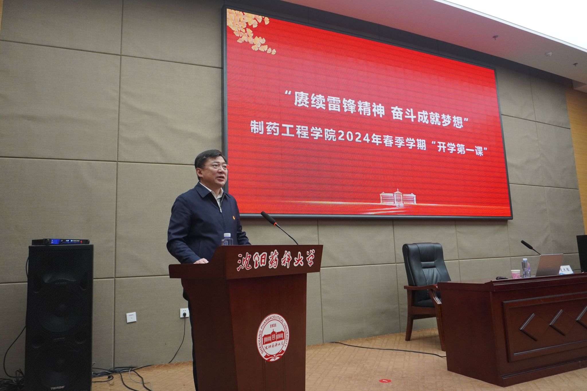 为贯彻党的教育方针,落实立德树人根本任务,引领学院师生弘扬雷锋精神,以昂扬的精神面貌奋进新学期,米兰milan官方网站于3月7日在南校区图书馆国为学术报告厅举办了以“赓续雷锋精神 奋斗成就梦想”为主题的新学期“开学第一课”活动。本次活动邀请北部战区总医院临床药师党大胜为学院师生授课。校党委副书记关雪峰、学院领导班子成员、全体辅导员以及师生代表参加活动。