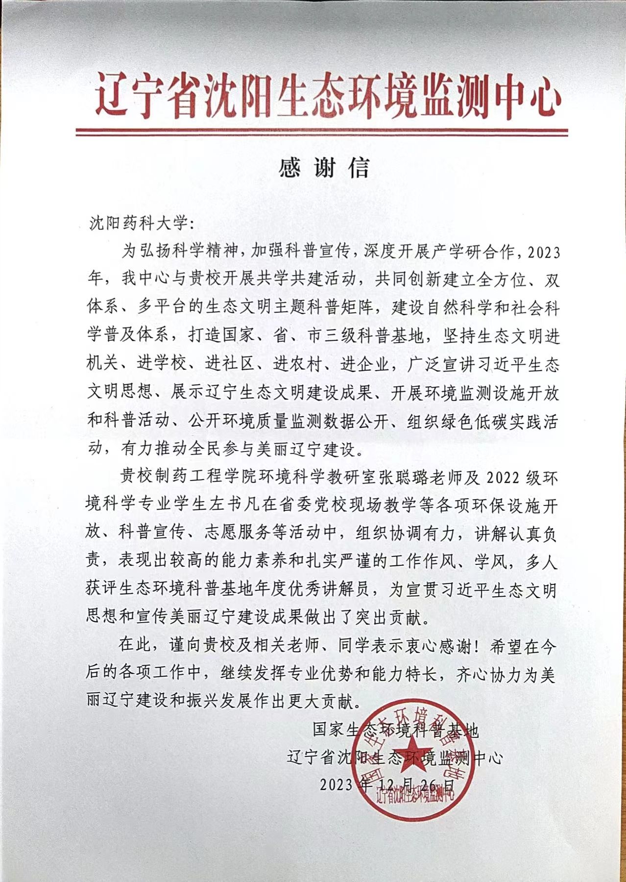 近日,米兰milan官方网站收到一封来自辽宁省沈阳生态环境监测中心的感谢信。信中对米兰官网环境科学教研室张聪璐老师及2021级环境科学专业学生左书凡,在省委党校现场教学等各项环保设施开放、科普宣传、志愿服务等活动中的能力素养、工作作风和学风给予高度肯定和赞扬,对米兰官网志愿者表示了由衷的感谢和诚挚的敬意。