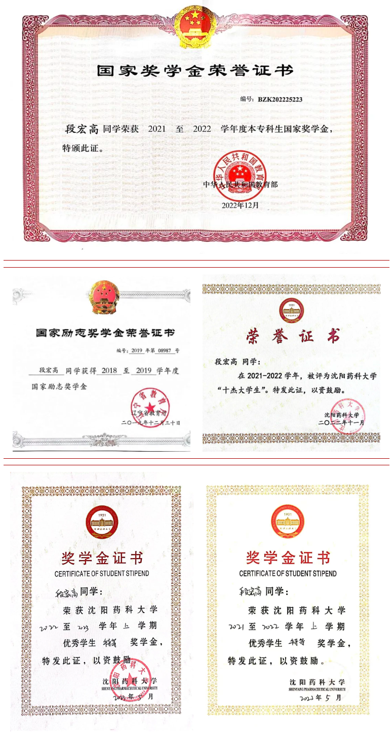 段宏高,米兰milan官方网站药物化学专业2020级本科生。前五学期平均成绩学院排名前1%,曾获国家奖学金2次,“十杰大学生”“十佳学习标兵”等各1次,曾服役于中国人民武装警察部队,获嘉奖和“四有”优秀士兵奖章各1次。发表SCI文章1篇,参与省级大学生创新项目1项,现已保研为北京大学药学院直博生(拟录取)。