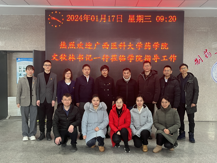 1月17日,广西医科大学药学院党委书记文秋林、药学院药物分析教研室主任苏志恒、学院办公室主任李福森、现代医药产业学院办公室主任谭斌、学院团委书记施承、学院纪委副书记兼组织员覃杨、办公室科员廖羽宁、中药学教研室秘书李琼一行8人来到米兰官网进行访问,就推动双方开展党建、学科平台建设、产学研、就业等交流学习进行调研。学院院长刘洋、院党委书记李哲、副院长刘丹、副院长秦铭泽、党委副书记武晓娜、药物化学教研室副主任侯云雷参加了调研座谈。