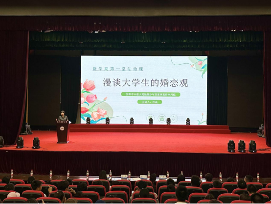 冷焱作“漫谈大学生的婚恋观”主题讲座。她通过翔实的案例和生动的讲述,结合审判实践以案释法,为同学们介绍了侵犯名誉权、侵犯隐私权、婚姻纠纷、财产纠纷等婚恋生活中常见的矛盾和问题,让参会同学对恋爱、交友有了更理性和深入的思考。