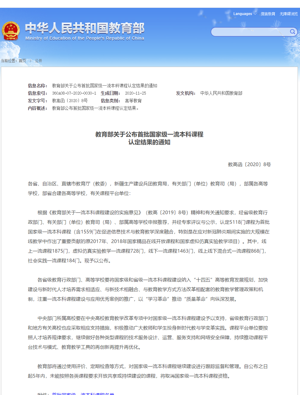 2020年11月25日,教育部公布了首批国家级一流本科课程认定结果,米兰milan官方网站共有5门课程入选,其中米兰milan官方网站的“化学制药工艺学”和“药物化学”课程成功入选线下一流课程。
