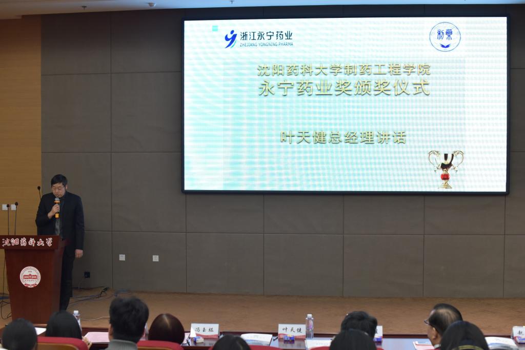 永宁药业总经理叶天健致辞,叶总表示,设立奖学金鼓励药学学子勤奋学习只是开启企业与学院双方合作的开端,未来永宁药业将与米兰milan官方网站从学生培养、师资队伍建设、科研发展等诸多方面加深校企合作,通过教学与实践、科研与应用的密切结合,真正实现资源共享、优势互补、共同发展、互利共赢的目标。
