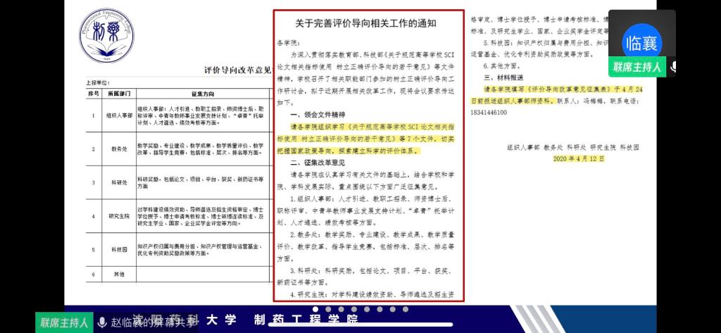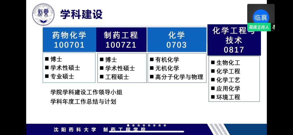 会上,学院党委书记李哲通报了目前学院疫情防控有关工作情况。学院院长赵临襄重点从关于完善评价导向相关工作、学科建设两方面进行工作部署。首先,赵院长结合学校绩效考核指标从发展战略、综合管理、制度建设等方面向参会人员阐述了“1-1-4-4”学院发展战略,并结合学校《关于完善评价导向相关工作通知》有关要求,带领参会人员共同学习了国务院、国家各部委相关工作文件。赵院长要求各教研室、实验中心会后要积极组织本部门教师进行学习,并结合米兰官网实际情况提出反馈意见。接下来,赵院长从学科建设管理、学科建设成果、学术影响力等方面,结合药物化学、制药工程、化学、化学工程与技术4个学科的发展实际进行学科建设整体工作部署。随后,学院副院长郭永学从“定一个目标、建一个团队、拟一份规划、填一张表格、写一份报告、做一次培训”等方面依次汇报了一流专业建设相关工作。