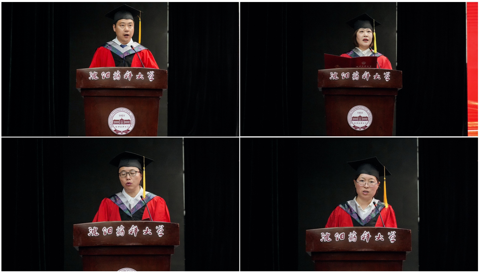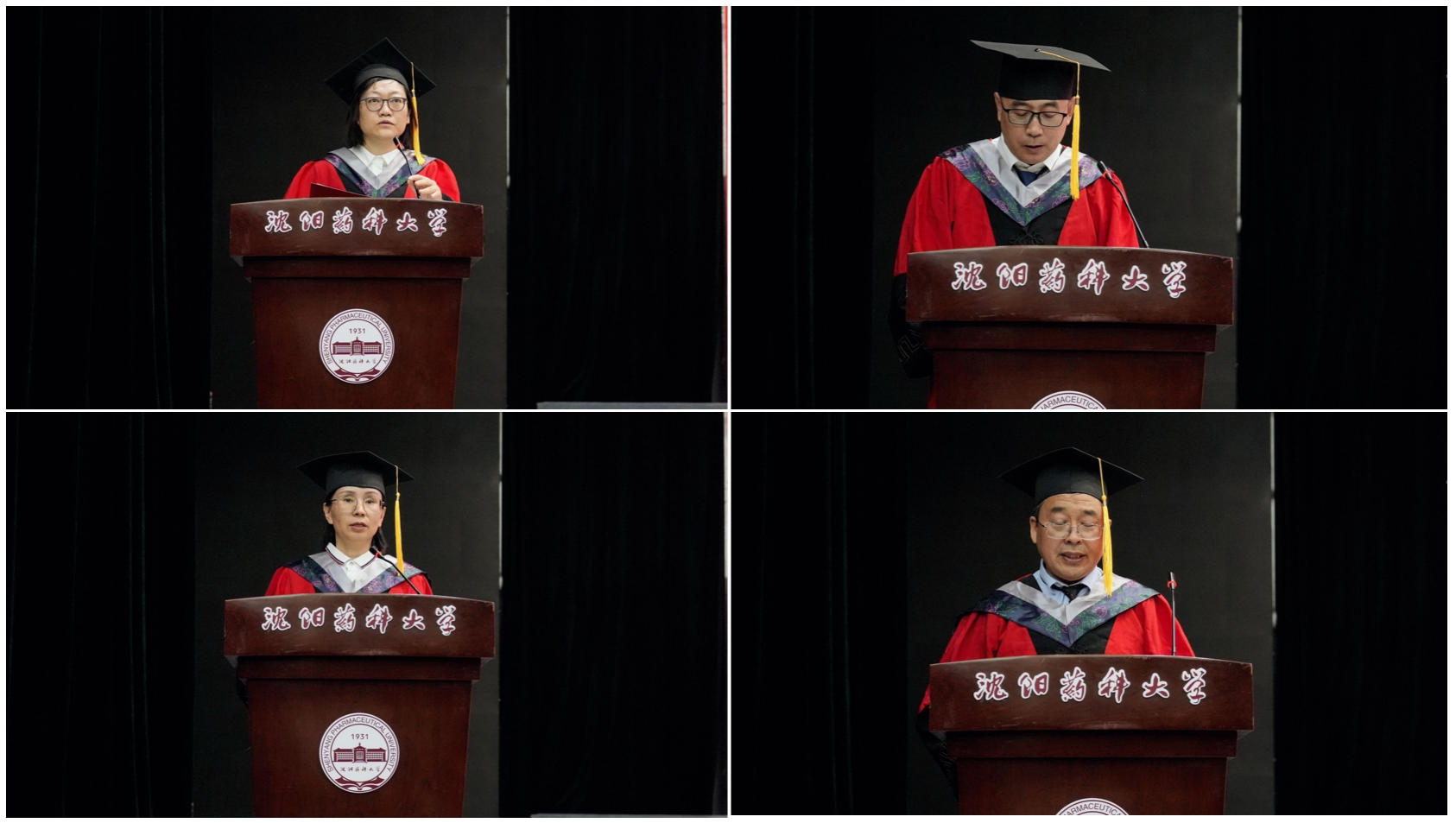 米兰milan官方网站院长刘洋教授宣读2024届博士学位授予名单;药物化学学科主席翟鑫教授、制药工程学科主席刘洋教授、化学学科主席王绍宁教授、化学工程与技术学科主席赵燕芳教授分别宣读各学科2024届硕士学位授予名单;制药工程专业负责人刘丹教授、药物化学专业负责人郭春教授、环境科学专业负责人张聪璐副教授、应用化学专业负责人胡春教授分别宣读2024届学士学位授予名单。